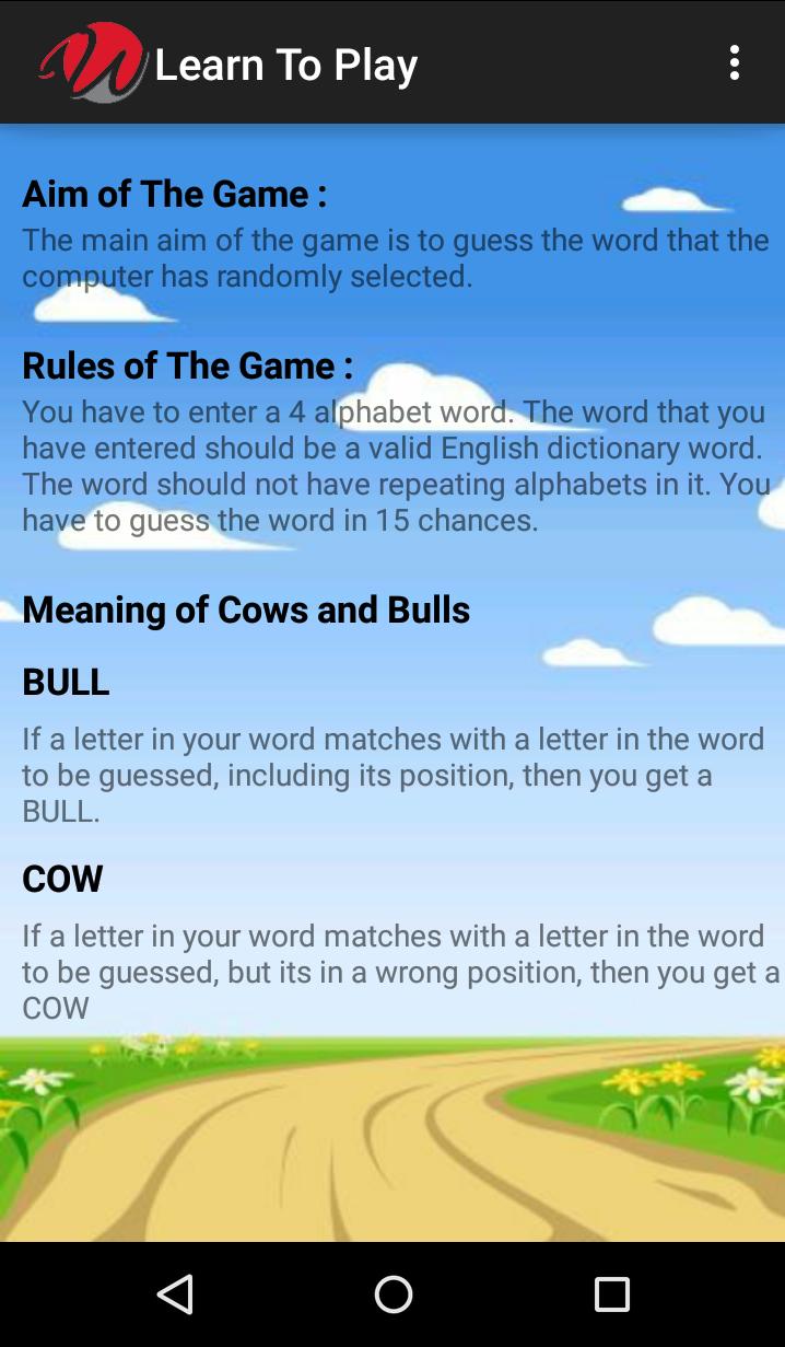 游戏的主要目的是猜测游戏随机生成的单词。该游戏将显示您输入的每个单词上的牛和公牛的数量(下面解释的牛和公牛的含义)。为了获胜,您必须获得4头公牛。