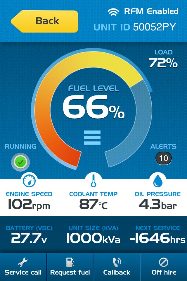使用GPS跟踪設備;監視您的功率使用情況,並關注燃油水平;接收自定義警報;請求燃料,請我們打電話給您,甚至是藉用機器的租用 - 全部按按鈕觸摸。