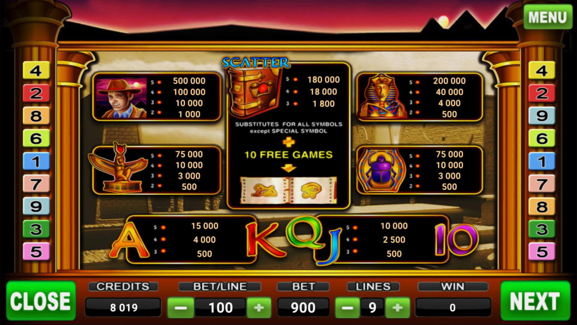 明亮多彩的插槽。當該國由大法老統治時,陷入了迷人的魔術和魔術世界。遊戲的情節充滿了奧秘和奧秘。在其中,有一個獨特的古代書籍和金色挖掘者,世界已知的奇觀和偉大的金字塔的地方。祝您成功!