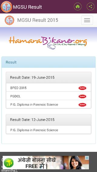 Maharaja Ganga Singh大學(Bikaner University)結果應用程序。更新結果