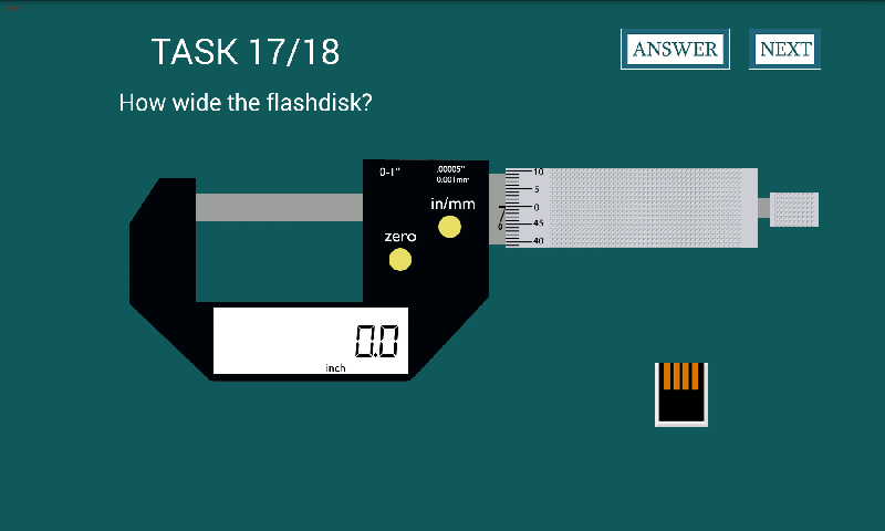 Micrometer Digital是簡單的應用程序,您可以用它來學習如何使用微米來測量對象的範圍。該遊戲是虛擬實驗室仿真應用程序之一,它為您提供了幾項測量給定對象的任務。您必須嘗試測量它,並通過單擊“答案”按鈕檢查結果。請嘗試玩得開心!