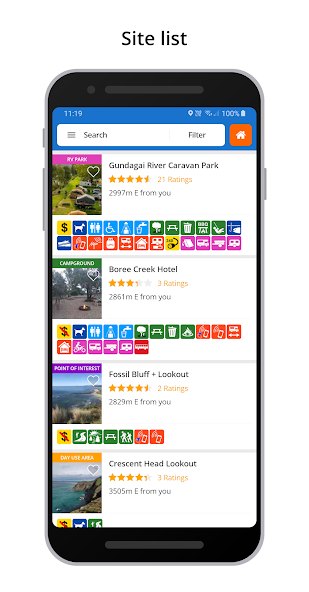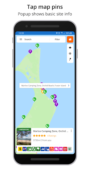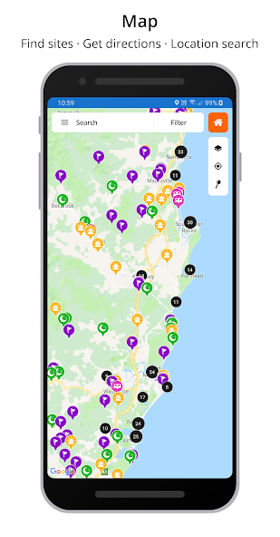 Wikicamps使找到網站變得非常容易。只需提出站點列表即可查看距您當前位置最近的站點,或使用地圖屏幕確切查看它們在街道或衛星地圖上的位置。